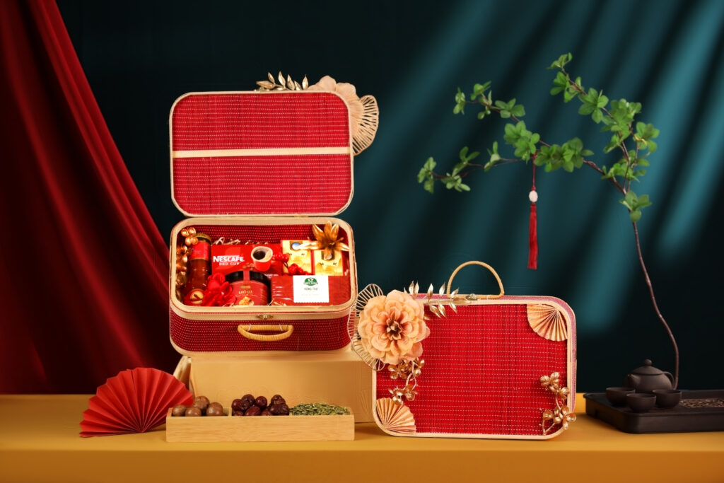 Lấy cảm hứng từ những chiếc rương du lịch cổ điển, mẫu vali đỏ viền mây tre mang đến một vẻ đẹp thanh tao, gần gũi nhưng không kém phần kiêu hãnh. Bên trong là sự chắt lọc của những hương vị đậm đà: Cà phê, Khô gà lá chanh, Hồng trà cùng các loại hạt dinh dưỡng. Đây là thiết kế hoàn hảo dành cho những doanh nghiệp muốn truyền tải thông điệp “Sống Xanh” (Sustainable) và tôn vinh tay nghề thủ công mỹ nghệ Việt Nam.