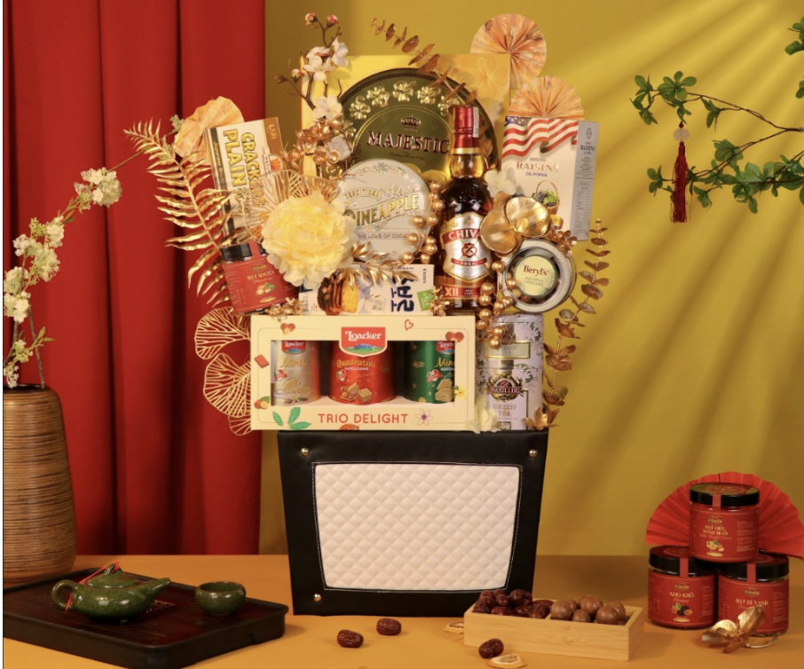 Thiết kế giỏ hình chiếc thuyền bọc vải gấm hoa văn cổ điển mang ý nghĩa “Thuận buồm xuôi gió” – một lời chúc vô giá trong kinh doanh. Sự pha trộn giữa sắc xanh ngọc bích của giỏ, điểm xuyết hoa lan hồ điệp vàng và những phong bao đỏ rực tạo nên sự tương phản đầy nghệ thuật. Bên trong là sự phong phú của bánh Danisa, cà phê và hạt dinh dưỡng thượng hạng.