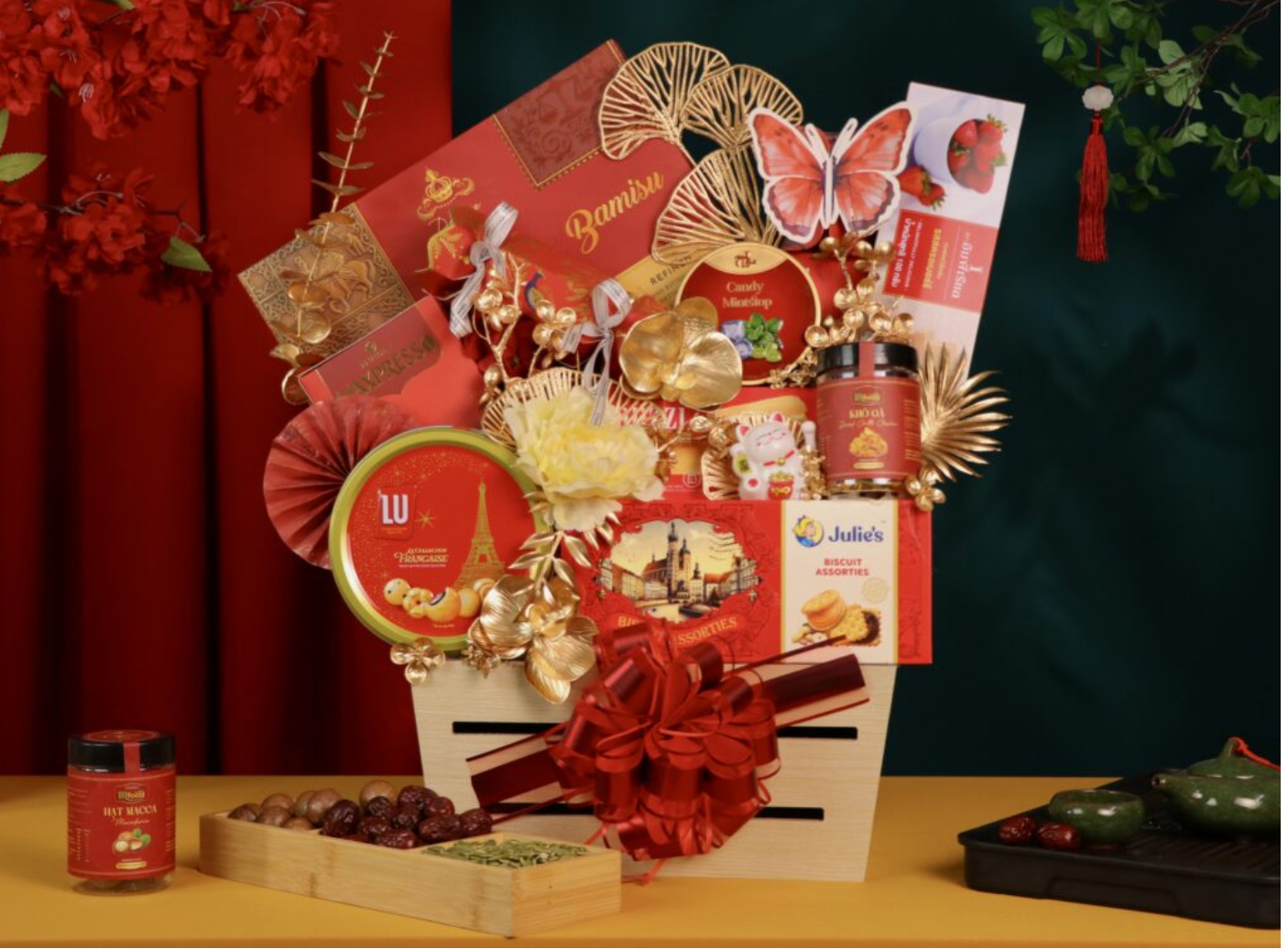 Sắc đỏ luôn là biểu tượng của tinh thần chiến thắng và sự nhiệt huyết, cực kỳ phù hợp với không khí hào hùng của ngày 30/4. Khay gỗ vòm mộc mạc nhưng vững chãi ôm trọn lấy chai vang Batise thanh tao, hộp bánh Pineapple đỏ rực và những hũ hạt macca, hạt điều bổ dưỡng. Thiết kế này vừa mang nét hoài cổ, vừa toát lên sự đẳng cấp khó cưỡng.